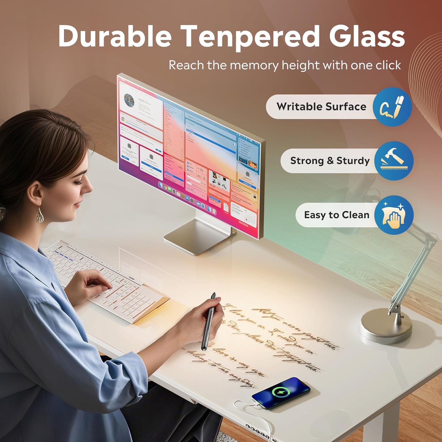 The 47.22 x 23.62in whole-piece tempered glass tabletop is the standout feature , it's scratch-resistant, easy to wipe down, and gives the desk a distinctly modern, elegant appearance. The glass surface provides a smooth writing experience and won't show wear like laminate or wood veneer over time.