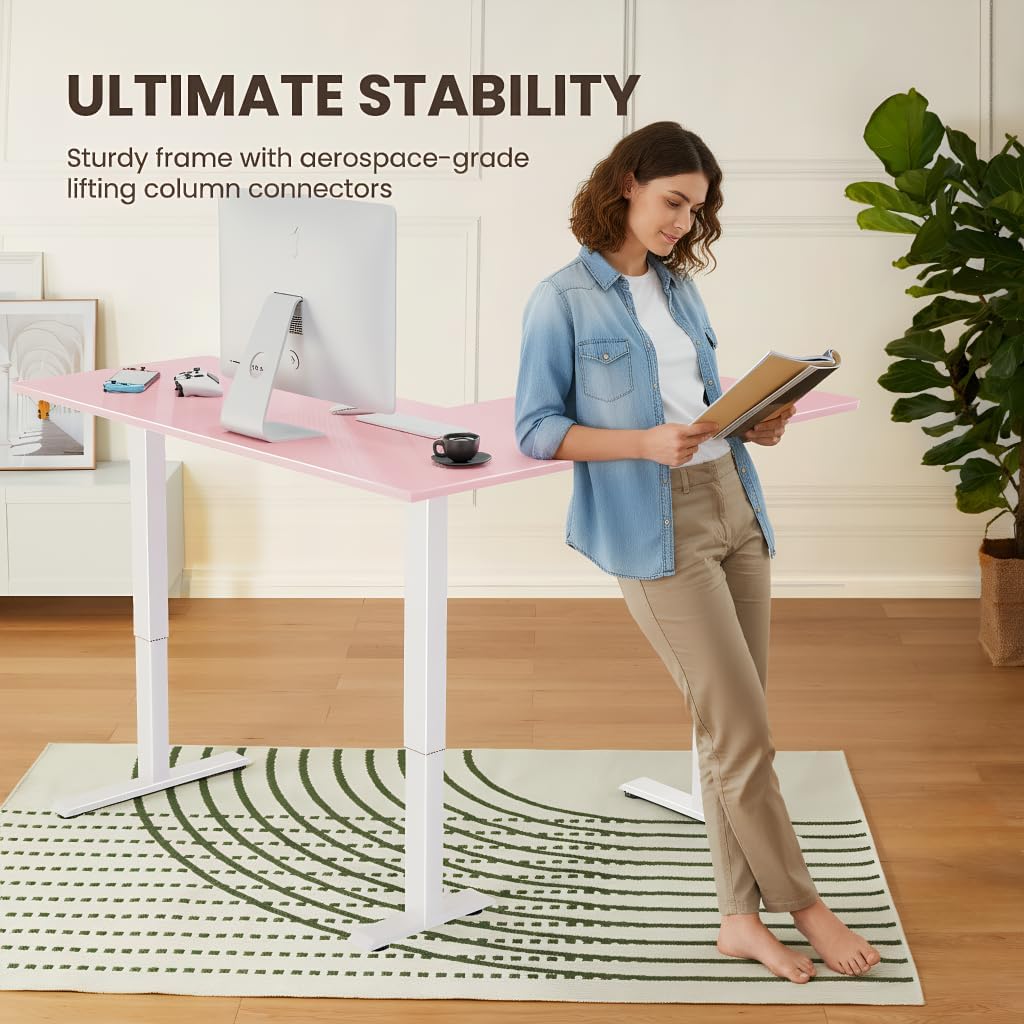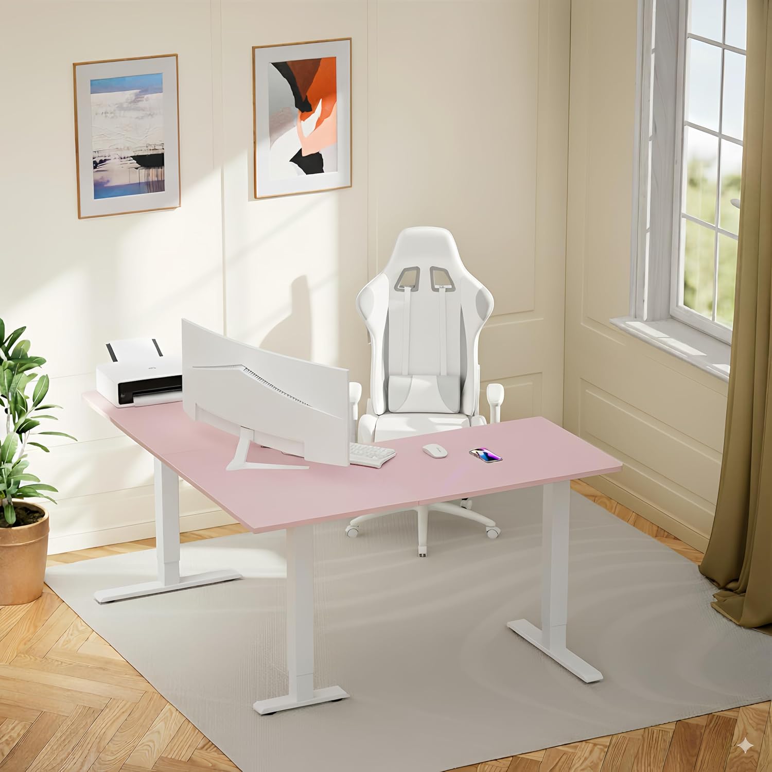 The 63"x55" L-shaped desktop provides generous workspace on both wings, with plenty of room for cable routing according to customer feedback. The pink finish gives it a distinctive aesthetic that stands out from the typical black and walnut options dominating the market.