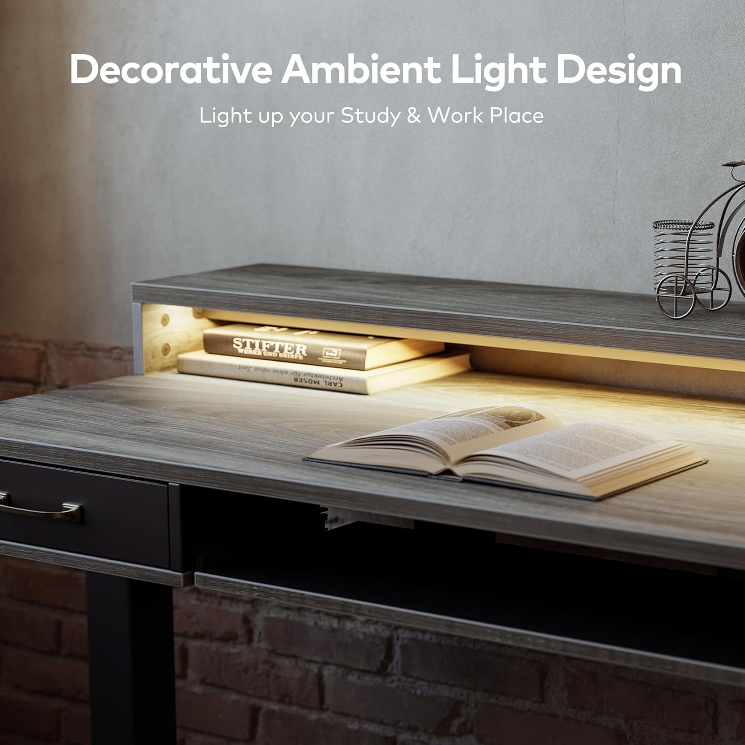 The FEZIBO 55x24 standing desk packs an unusual amount of built-in organization , double drawers, a keyboard tray, and a monitor stand , into a mid-size electric desk with LED accent lighting. It's a strong pick for home office users who want a clean, clutter-free setup without buying a stack of desk accessories separately.