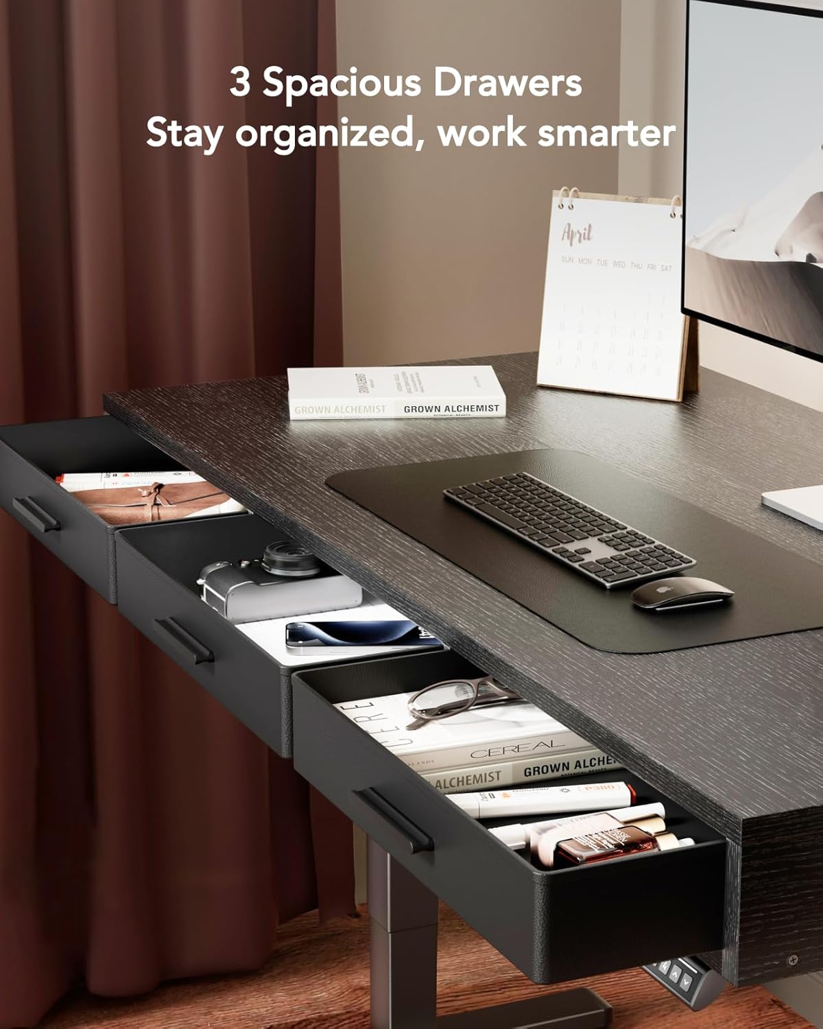 The HUANUO Electric Standing Desk stands out by integrating three built-in drawers directly into the desktop , a feature rarely seen in this category that eliminates the need for separate desk organizers. With a 55x28-inch engineered wood surface, single-motor electric adjustment, and UL certification, it delivers a solid home office essentials package for users who prioritize a clutter-free workspace.