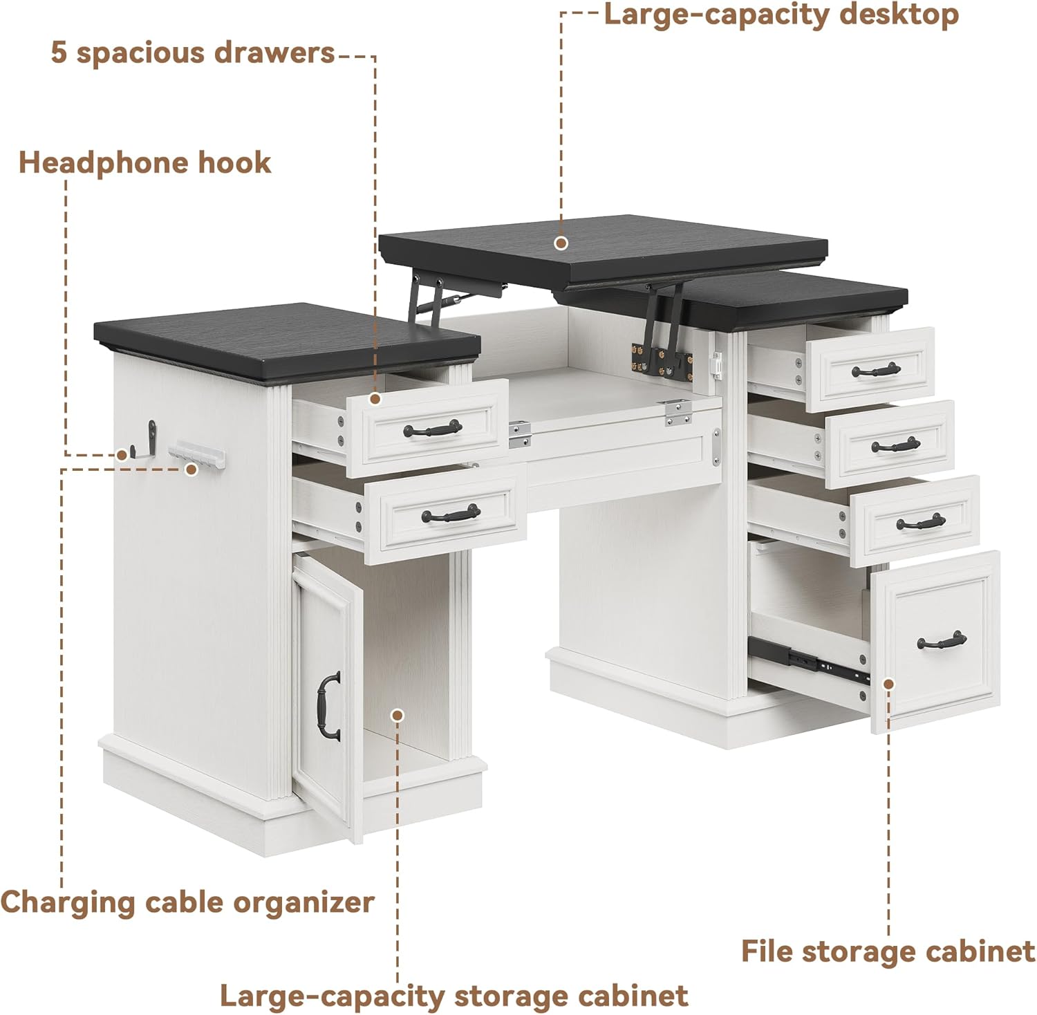 The Jocoevol Farmhouse Executive Desk combines a pneumatic gas spring mechanism with serious storage , six drawers, a file cabinet, and a keyboard tray , all wrapped in a farmhouse aesthetic. It's built for the home office worker who wants seamless sit-stand transitions without sacrificing desk organization, though the manual lift and limited height range mean it works best as a sit-to-perch desk rather than a full standing solution.