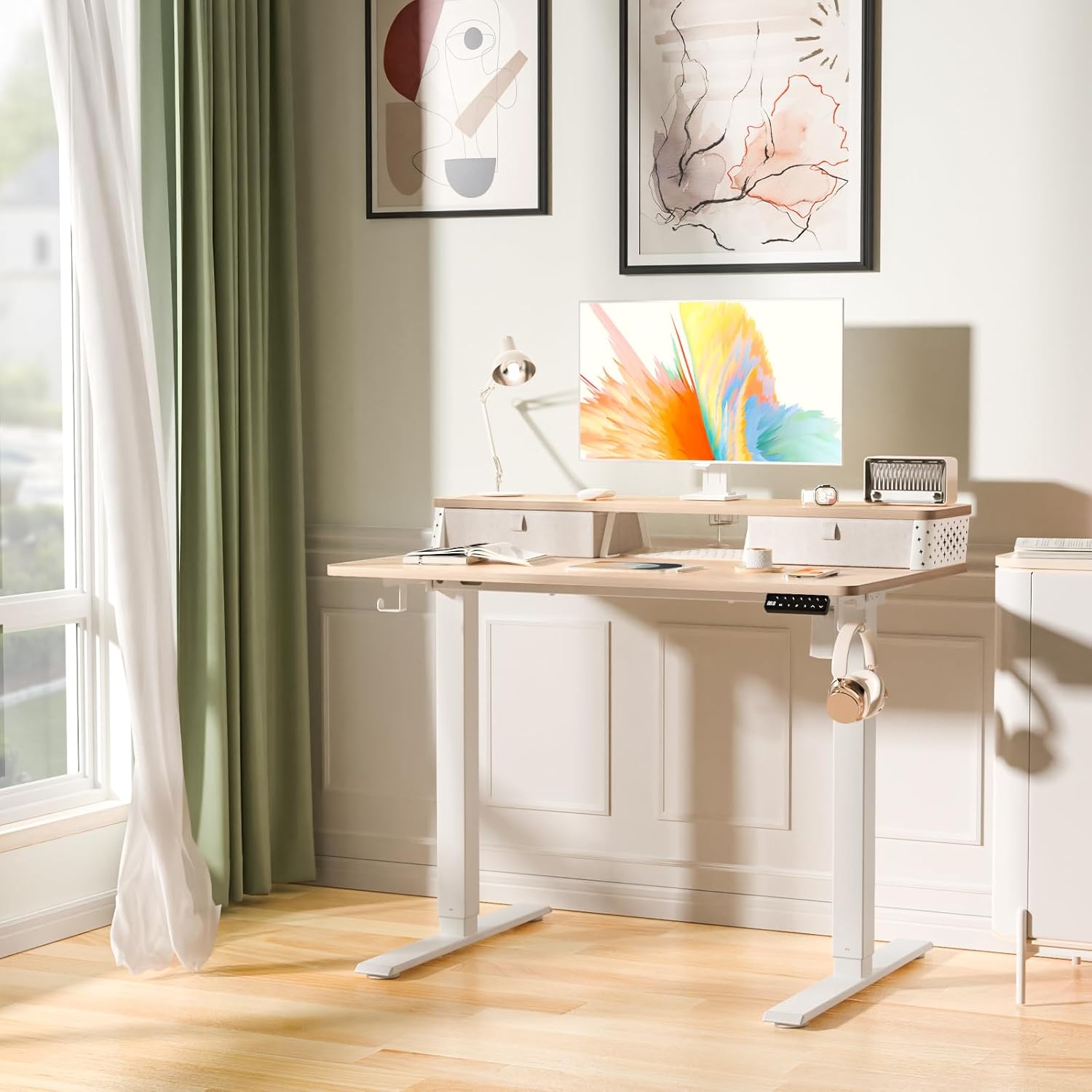The standout features here are the two built-in storage drawers, which are uncommon on standing desks in this tier and provide convenient Organization for Office essentials. The desk is C-clamp mount compatible, allowing you to add a monitor arm to free up even more desktop real estate.