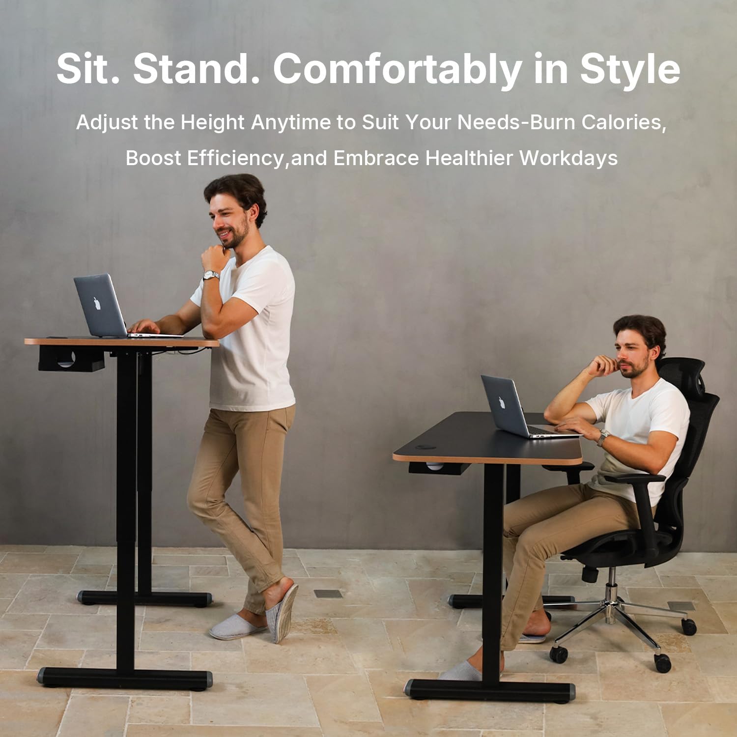 The steel T-frame with crossbar provides good stability for a single-motor desk. At the full 46-inch height, you may notice minor wobble under heavy typing, which is typical for this class of desk.