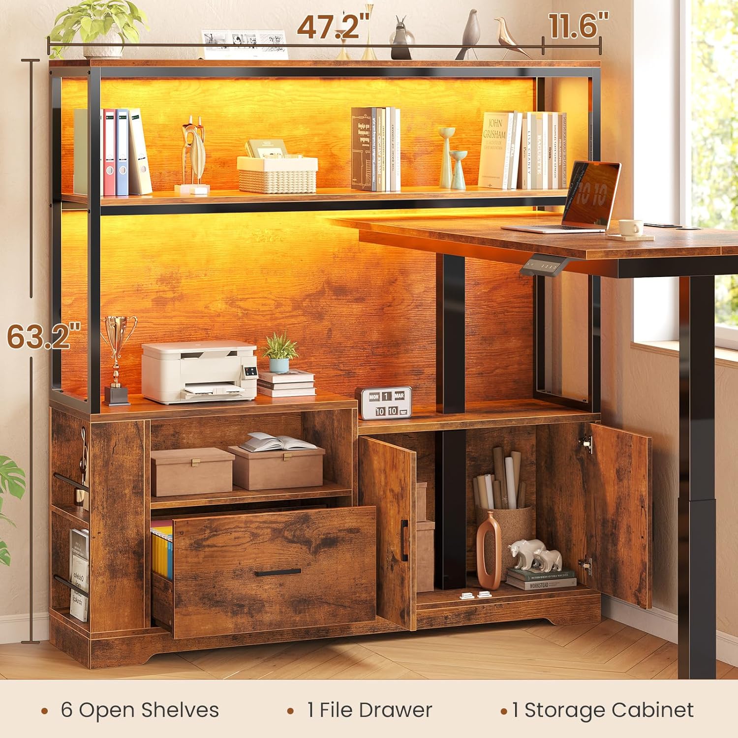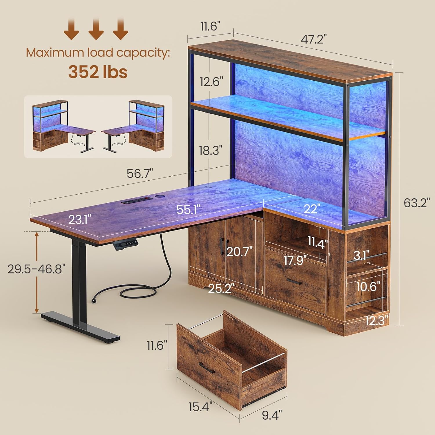 The SEDETA 56.7" L-Shaped Standing Desk is a compelling all-in-one workstation for home office users and gamers who want storage, power, and LED ambiance built right into the desk. The combination of file drawers, bookshelf hutch, power outlets, and USB ports means fewer accessories cluttering your space.