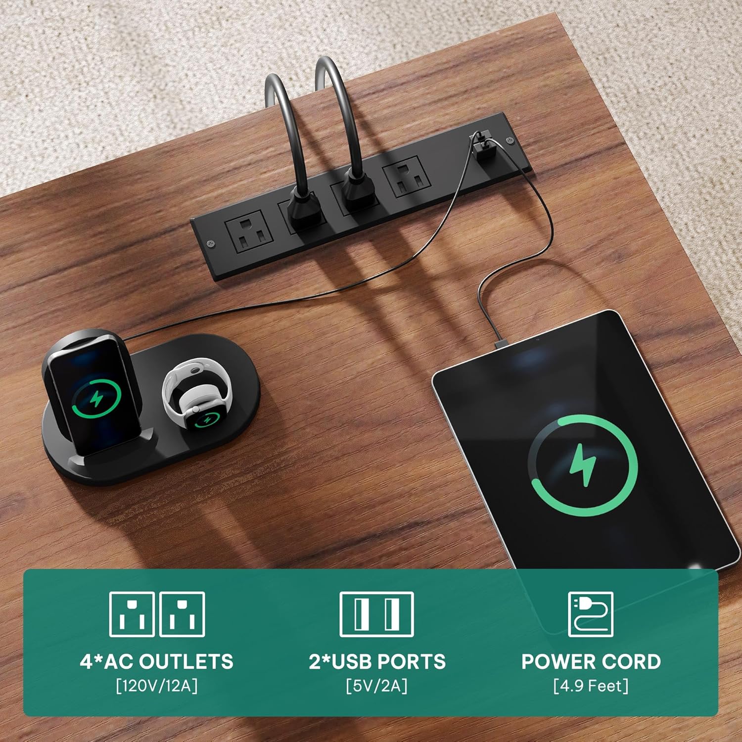Built-in 2 USB ports and 4 power outlets keep devices charged without cable clutter